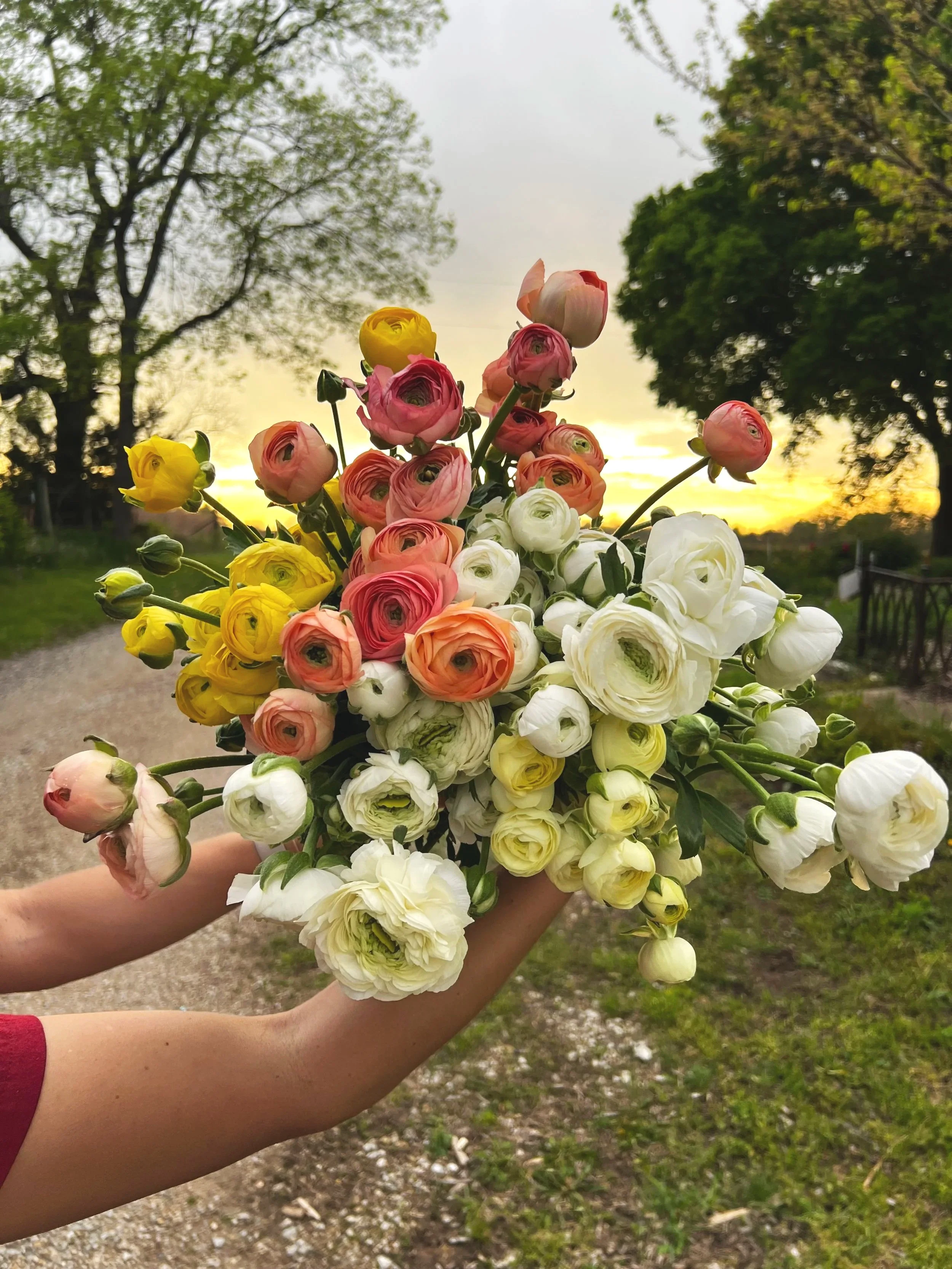 We offer both a growers choice (no color selection) and color-specific bucket options. For color specific orders, we work off a color palette rather than specific color names or inspiration pictures. Examples are descriptions such as white-peach-light pink or “as many bright colors as possible,” or “white, green, and pale pink.” We are sometimes limited in the colors we can provide at different times of the year (e.g., we do not typically have blue flowers in September).