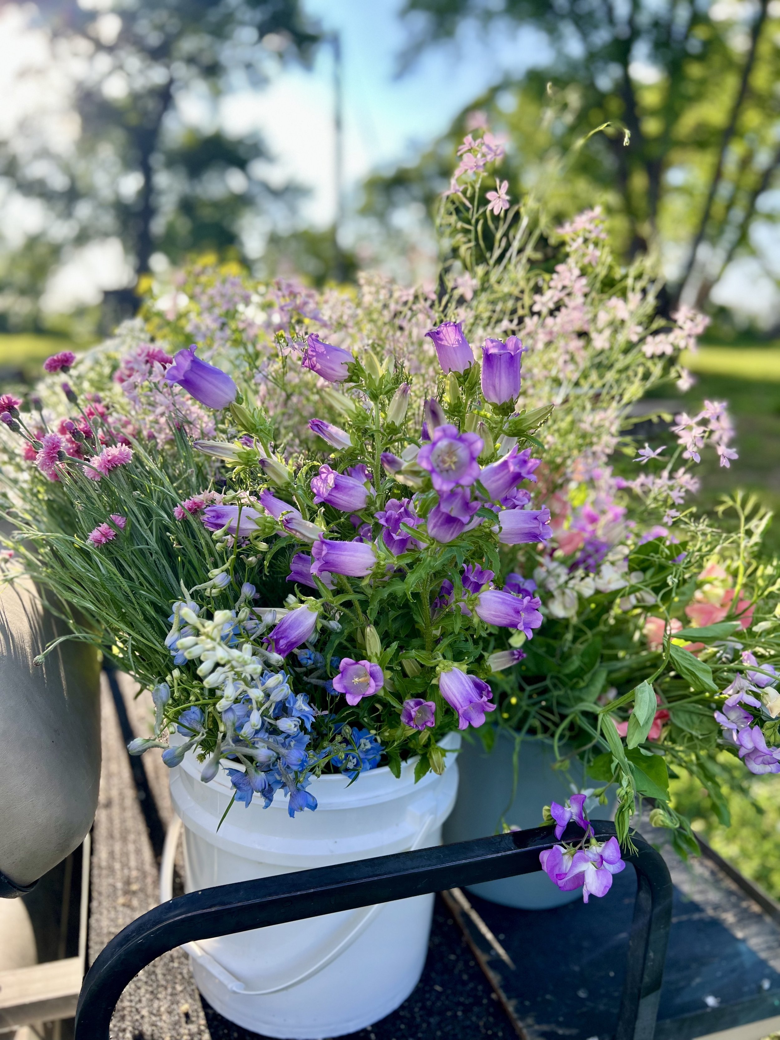 The aesthetic of our DIY buckets can be described as whimsical, garden-party, English cottage, eclectic, wild, romantic, French country, and rustic. A client once described our buckets to me as “Bridgerton meets the Kansas prairie.” Each flower is a conversation starter - and you are contributing to sustainable, environmentally friendly practices by buying locally grown Kansas flowers.